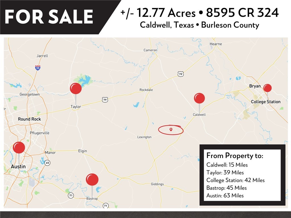 12.77+/- acres in the western portion of Burleson County! This property is ready to go with a water meter in place, overhead electricity available, and a new pipe & wood entrance off of CR 324 with gravel & culvert. Ag exemption in place. Hard top road frontage from CR 324, and paved FM 696 just a few feet away. Mostly wooded property with several open areas in the front of the property and hardwoods in the back. Partial fencing on 3 sides of the property. Close proximity to US-290, US-79, and HWY 21. Located centrally in the Texas Triangle, just 15 miles to Caldwell, 39 miles to Taylor, 42 miles to College Station, 45 miles to Bastrop, and 63 miles to Austin. Do not miss out on this prime property that is ready for your dream home!