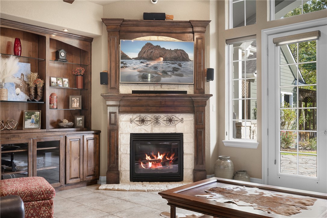 Inside, an open layout connects the spacious living and dining areas, featuring hardwood and tile floors, high ceilings, and abundant natural light. The gourmet kitchen is designed for both function and beauty, with custom cabinetry, ample counter space, and seamless flow into the living area centered around a cozy fireplace. The primary suite offers a private retreat complete with a spa-inspired bath, dual vanities, soaking tub, and separate shower.