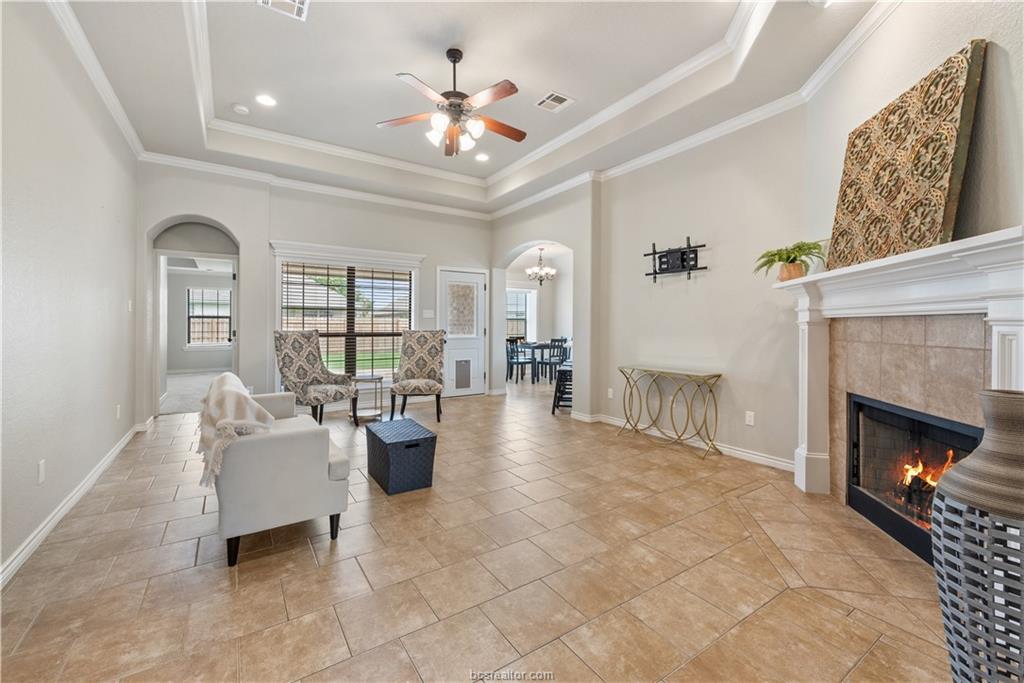 AVAILABLE for IMMEDIATE MOVE IN!! Welcome to this 3 bedroom 3 bath home freshly updated. The spacious living area is accented with a cozy, corner fireplace. The open concept floor plan has an easy flow from living to dining and kitchen. The beautiful kitchen has been modernized with quartz countertops, white cabinets, stainless appliances, and oversized, single basin sink. Other custom features throughout include crown molding, tray ceilings, new cabinet hardware, updated light fixtures, and modern mirrors. The primary ensuite bath is the place to relax - walk-in shower with three shower heads and subway tile, double vanities, and two walk-in closets. Two additional bedrooms at the front of the home each have their own bathrooms. Outdoor space has been improved for entertaining with an extended paver patio. Call to schedule your showing today.